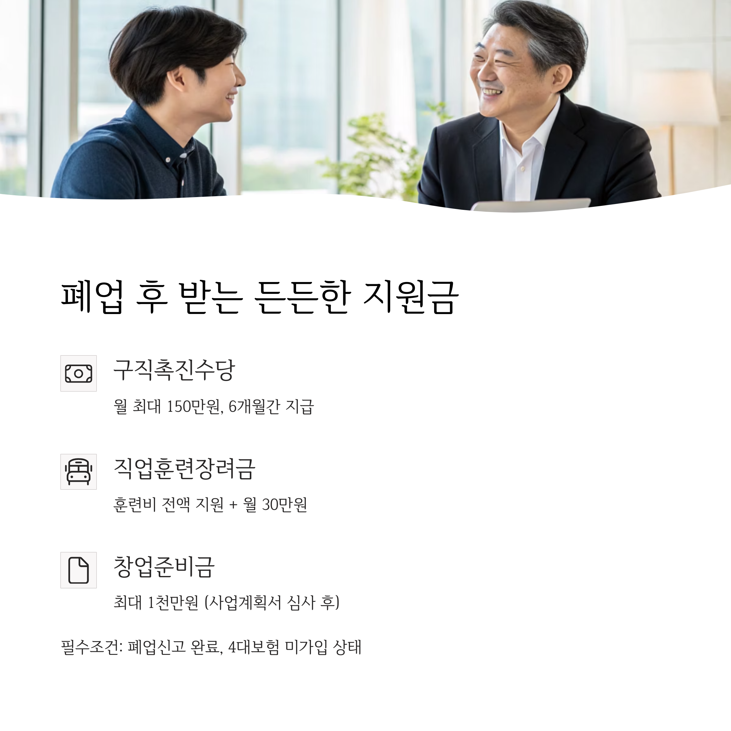 폐업 후에는 재창업 지원금, 사업정리 비용, 전직장려수당 등