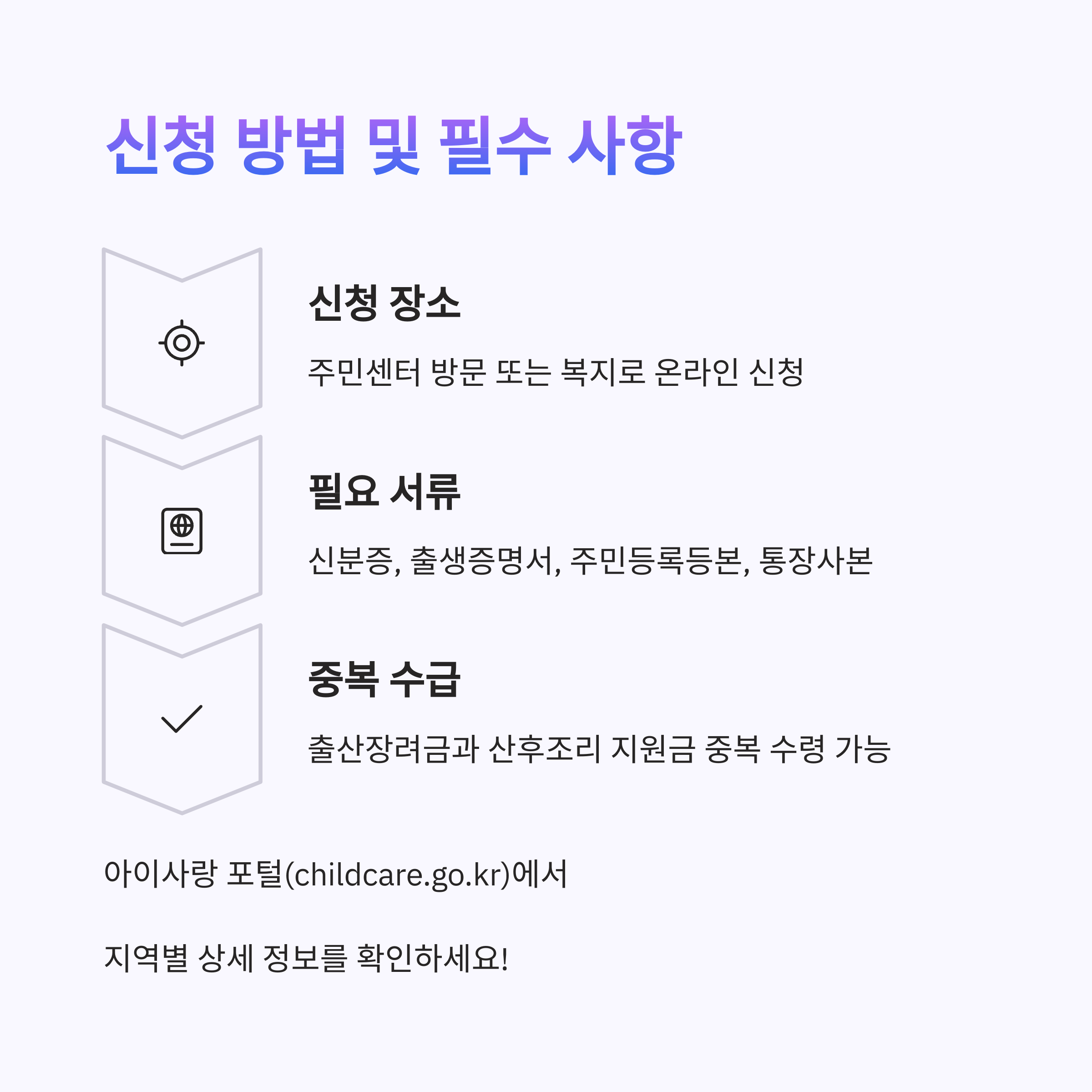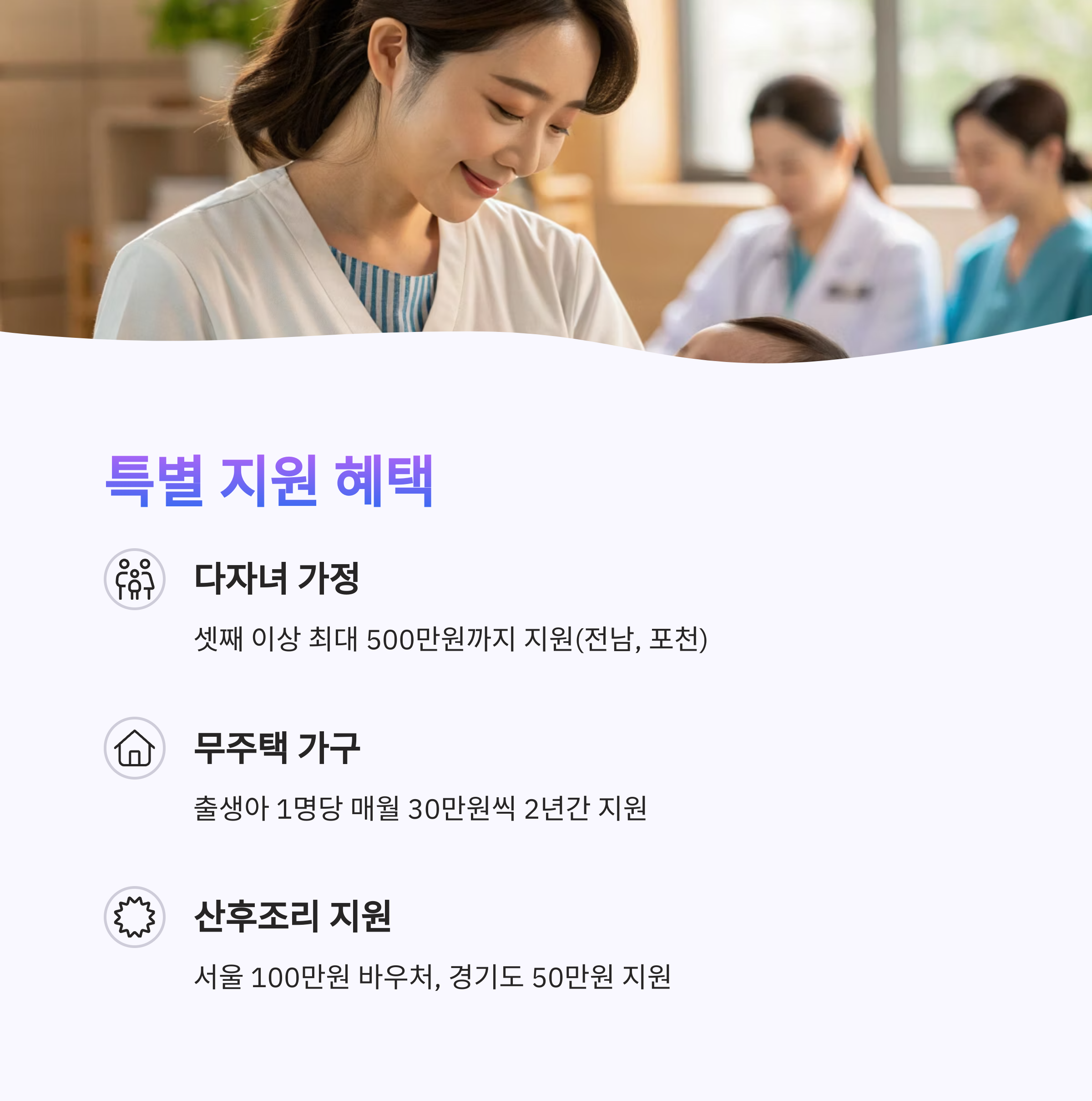 기타 특별지원 – 일부 지역은 다문화가정, 미혼모, 분만취약지, 쌍둥이 출산 등에도 별도 지원이 있음. 세부 기준은 각 지자체 조례 및 공고문 참고.
