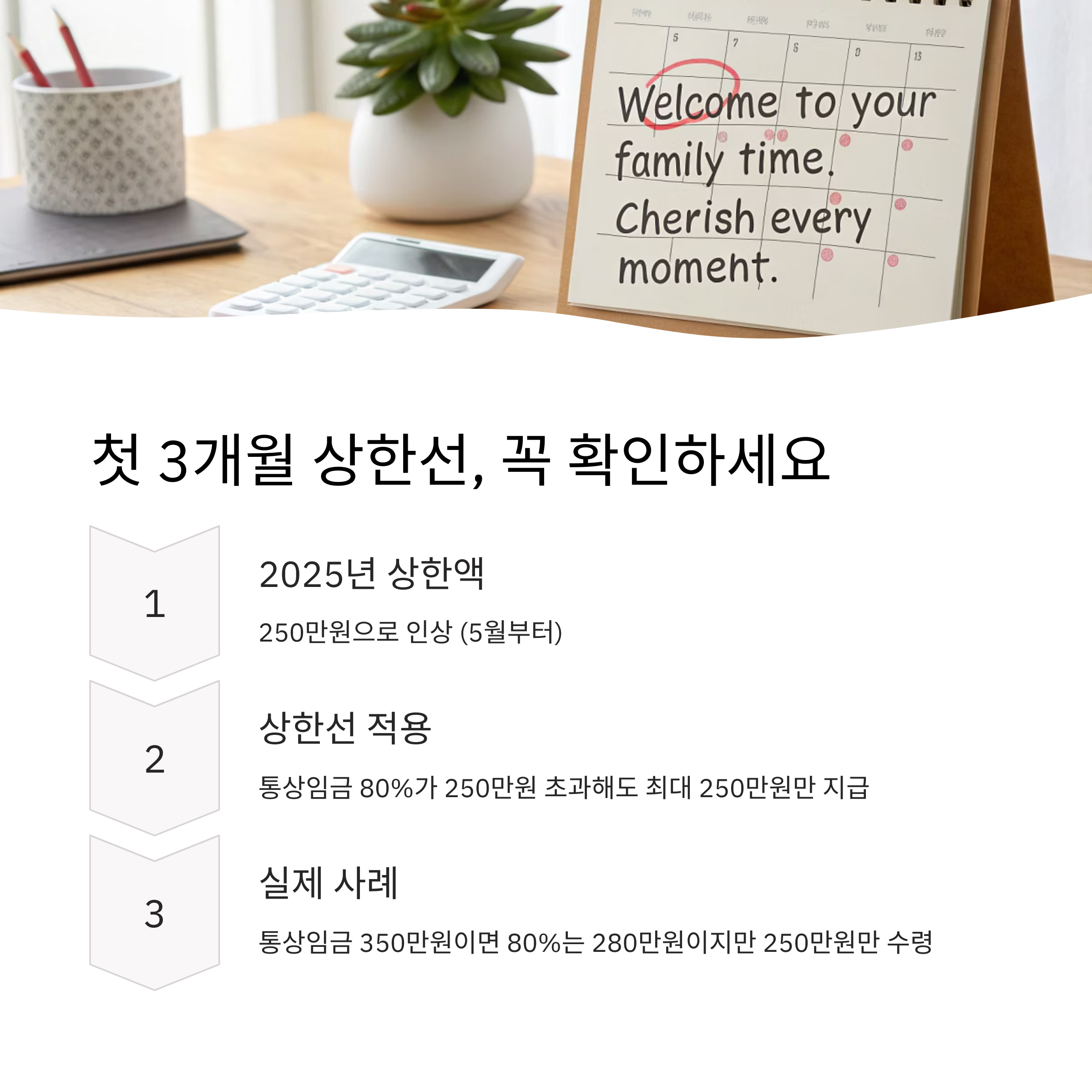 2025년 5월부터 첫 3개월 육아휴직 급여 상한이 250만 원으로 인상돼요.