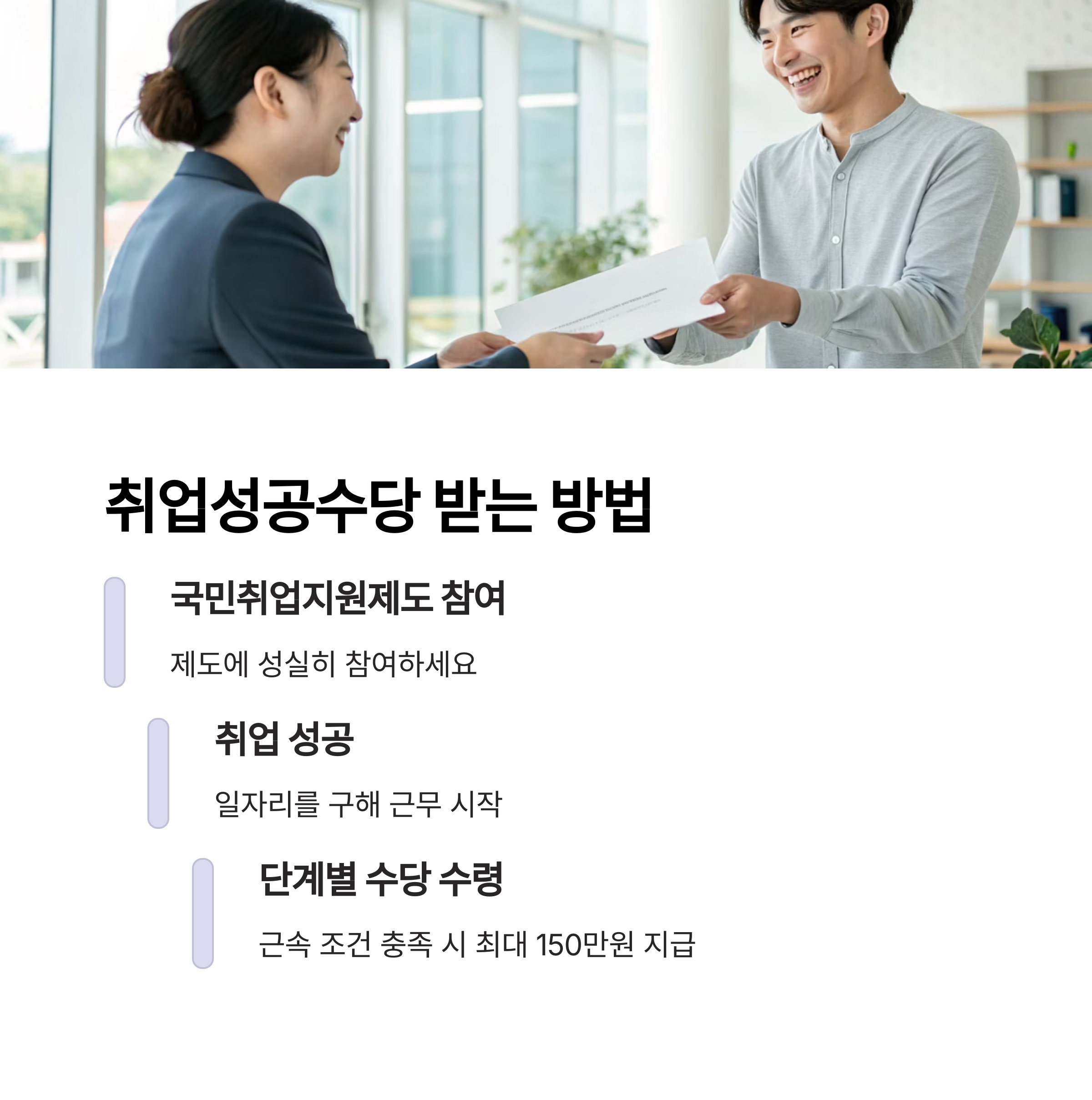 취업성공수당은 국민취업지원제도에 참여한 후 취업에 성공한 사람에게 주어지는 인센티브입니다. 근속 요건과 소득 조건을 만족할 경우 최대 150만 원까지 받을 수 있습니다. 단, 수당은 단계적으로 지급되며 일정 기간 이상 근무해야 하기 때문에 취업 후에도 꾸준한 근속이 필요합니다.