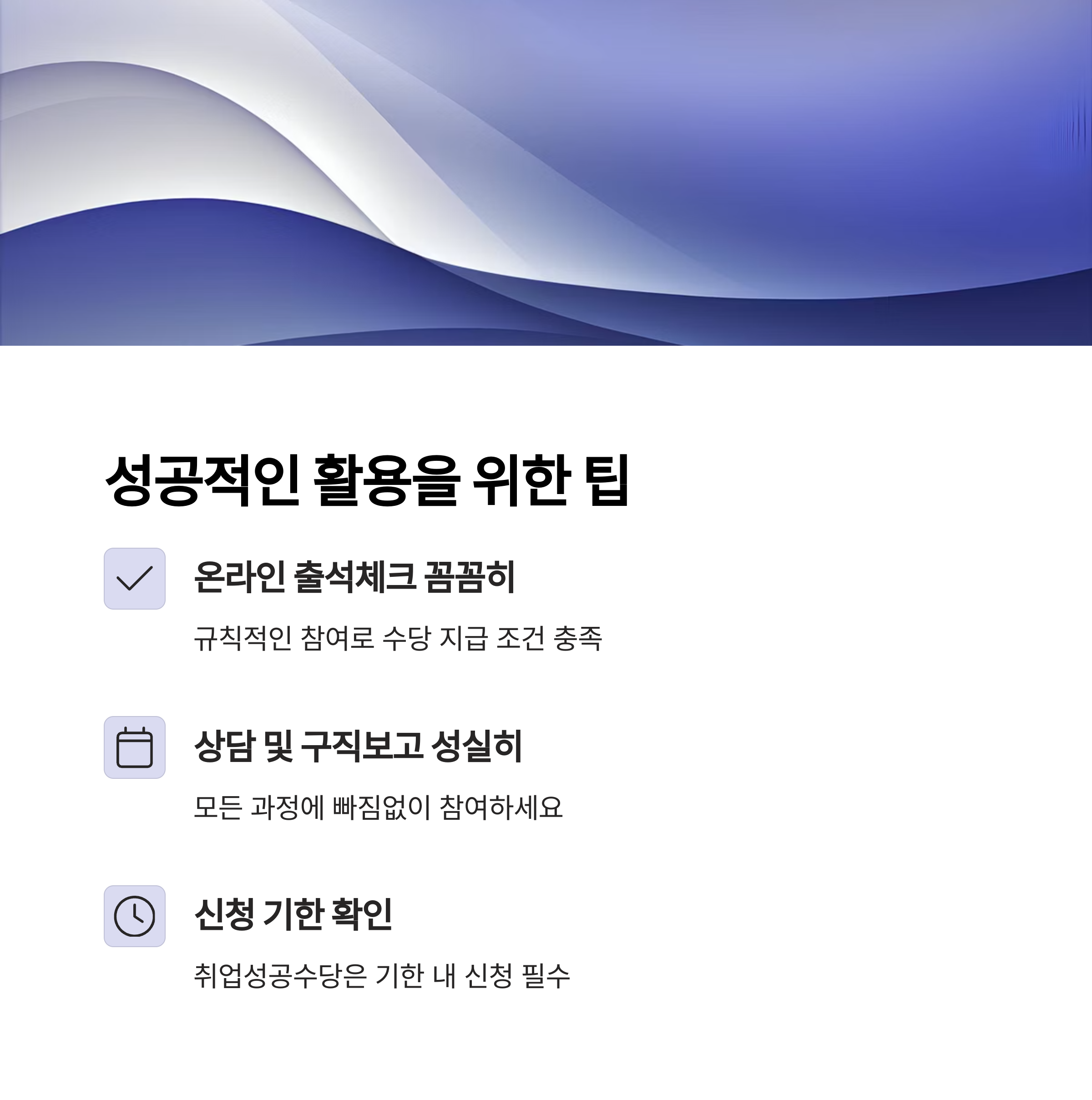 국민취업지원제도취업성공수당을 제대로 활용하기 위해서는 참여자의 성실한 구직활동 이행이 핵심입니다. 온라인 출석체크, 상담 참여, 구직보고 등의 과정을 꼼꼼히 챙겨야 수당 수령이 가능하며, 특히 취업성공수당은 근속 여부와 신청 기한에 따라 지급 여부가 달라질 수 있으므로 주의가 필요합니다.