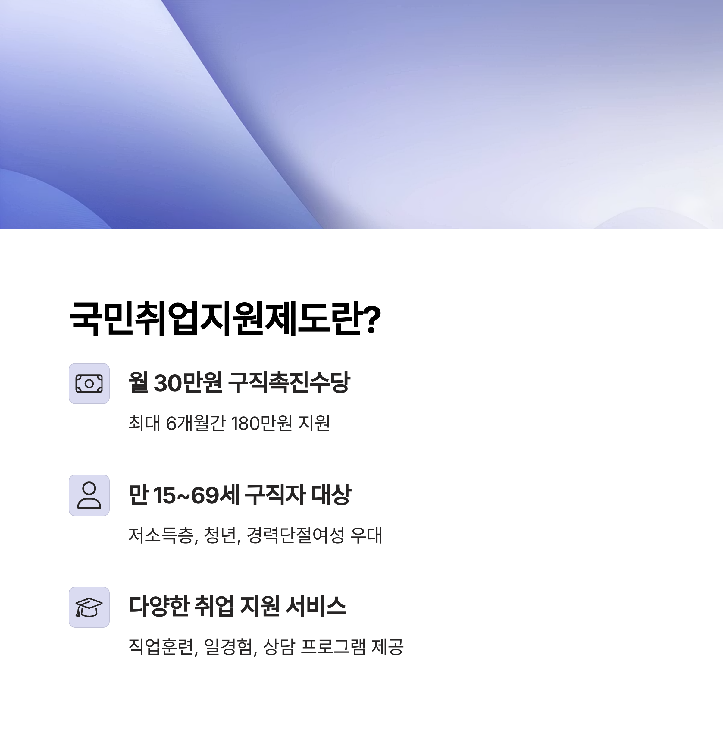국민취업지원제도는 만 15세 이상 69세 이하의 구직자 중 일정 요건을 충족하는 사람을 대상으로 합니다. 특히 저소득층, 청년, 경력단절여성 등 취업 취약계층이 주요 대상입니다. 참여자는 월 30만 원씩 6개월간 최대 150만 원의 구직촉진수당을 받을 수 있고, 직업훈련, 일경험, 상담 프로그램 등 다양한 서비스를 함께 제공합니다.