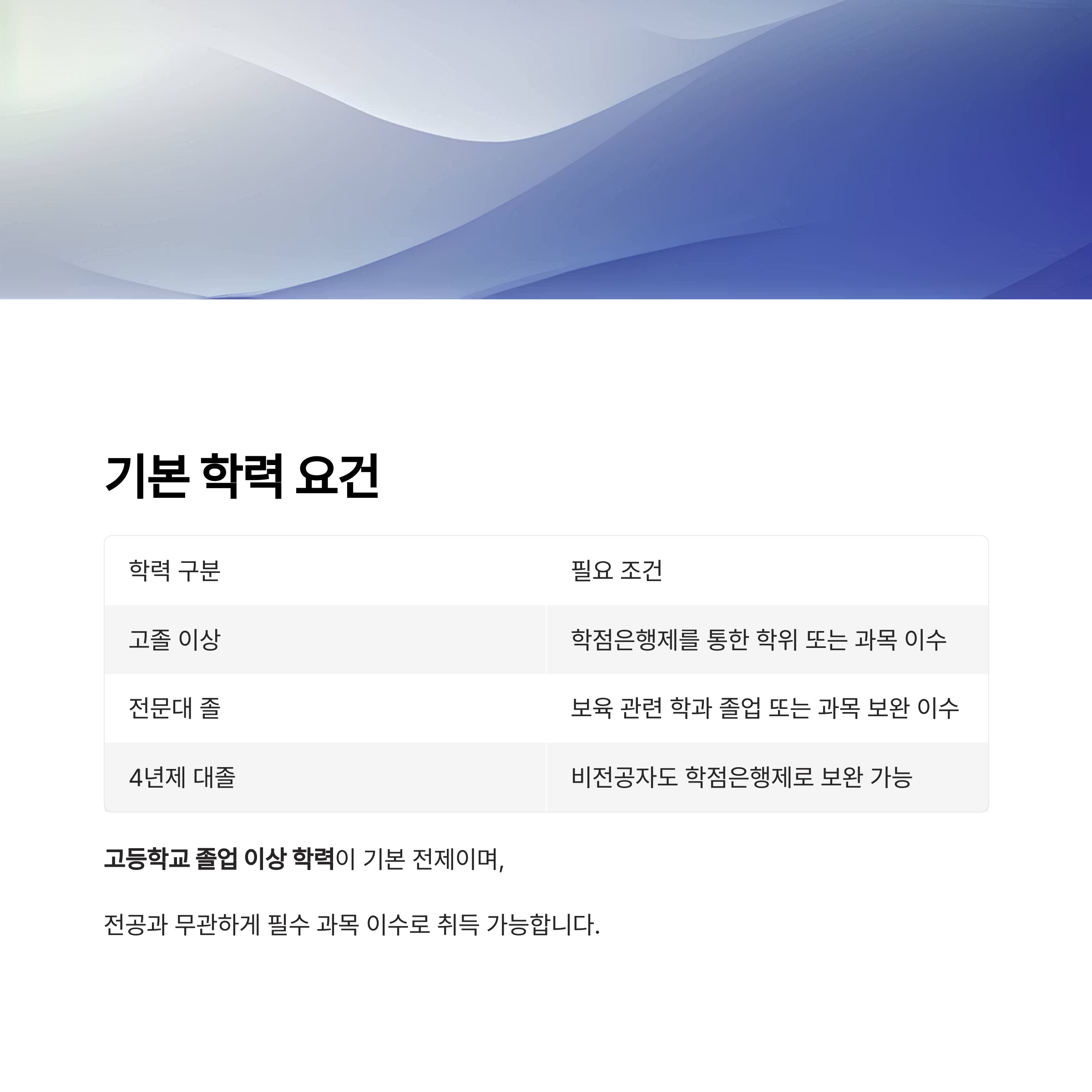 보육교사자격증취득방법의 기본 전제는 고등학교 졸업 이상의 학력을 보유하고 있어야 합니다