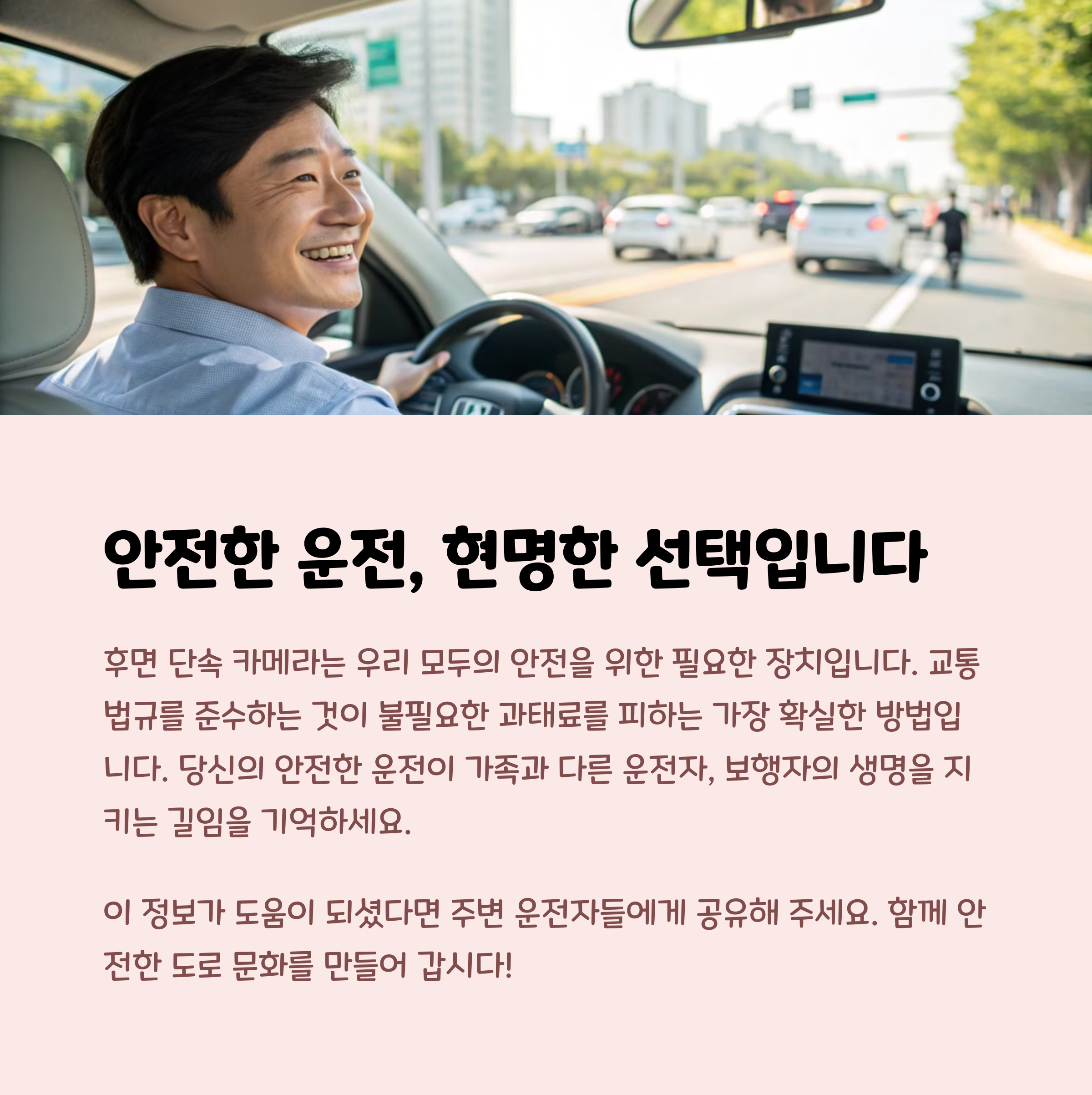 이제는 앞만 보고 달리는 시대는 지났습니다. 2025년부터는 후면까지 주의해야 하는 시대! 교통법규를 지키는 운전 습관이 곧 나와 가족, 이웃의 안전을 지키는 길입니다. 모두가 더 안전한 도로를 위해 함께 노력해요.