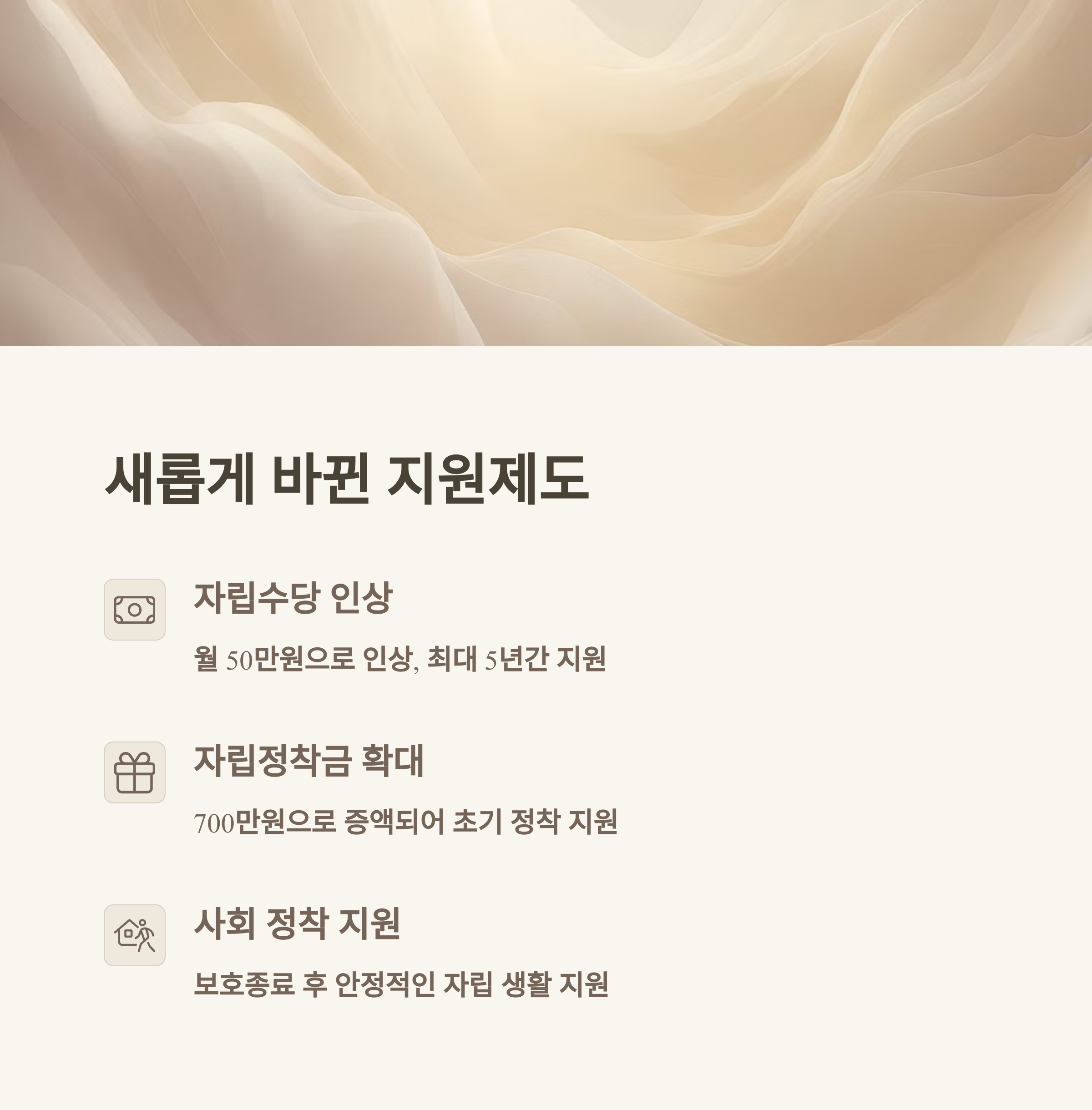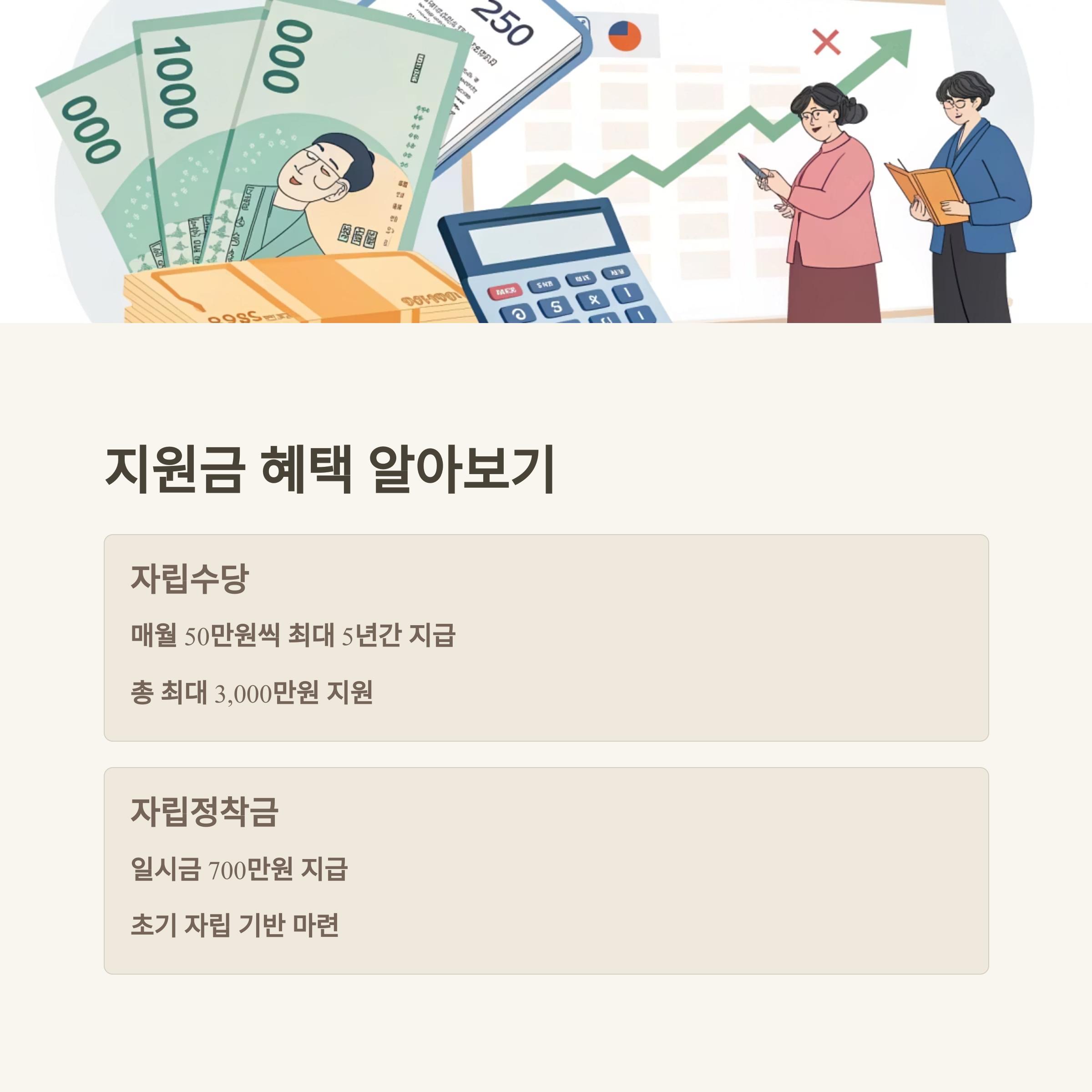 2025년 기준 자립수당은 월 50만 원으로 인상되었고 최대 60개월 동안 지원돼요.