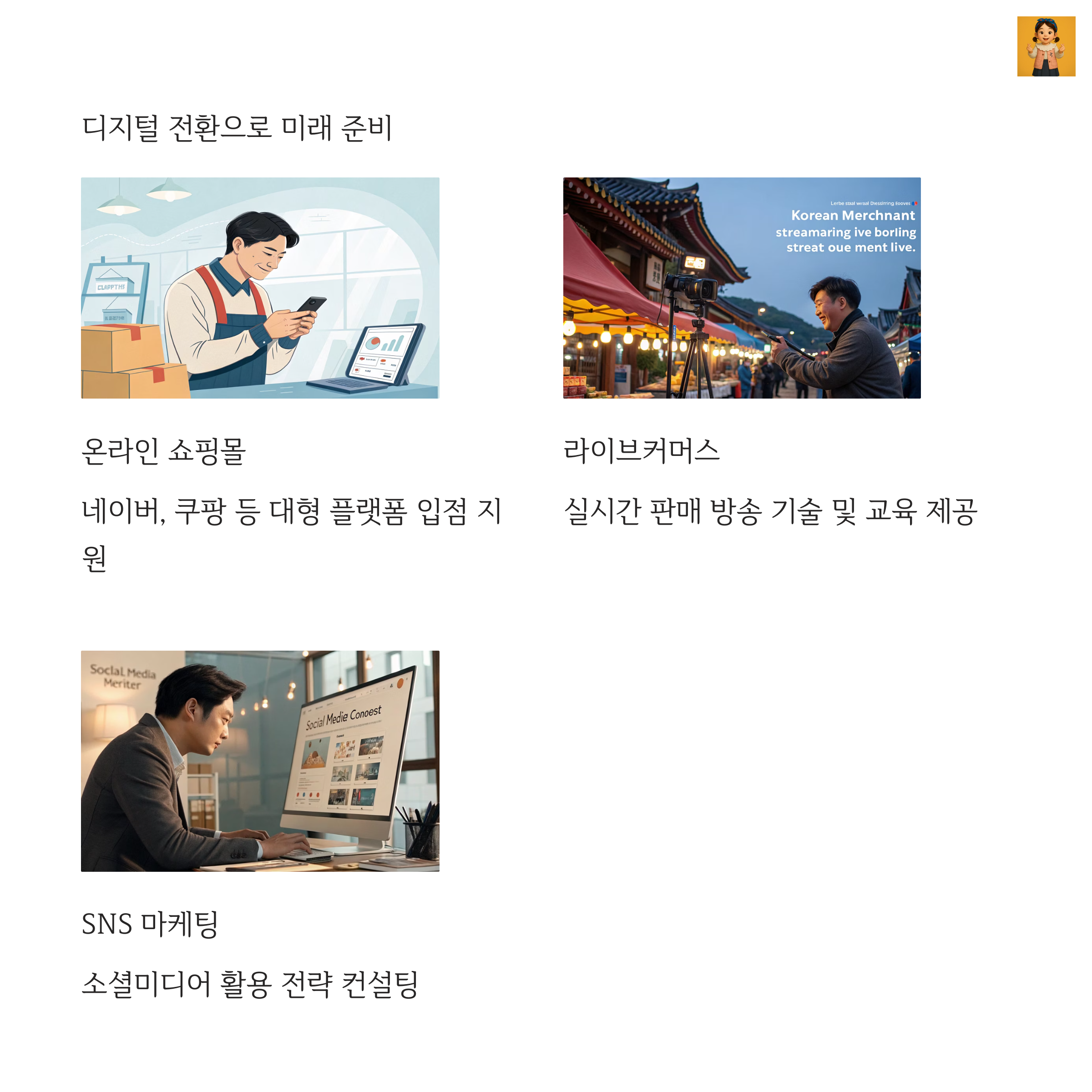 정부는 쇼핑몰 입점, 네이버 스마트스토어, 라이브커머스 진출까지 지원합니다.