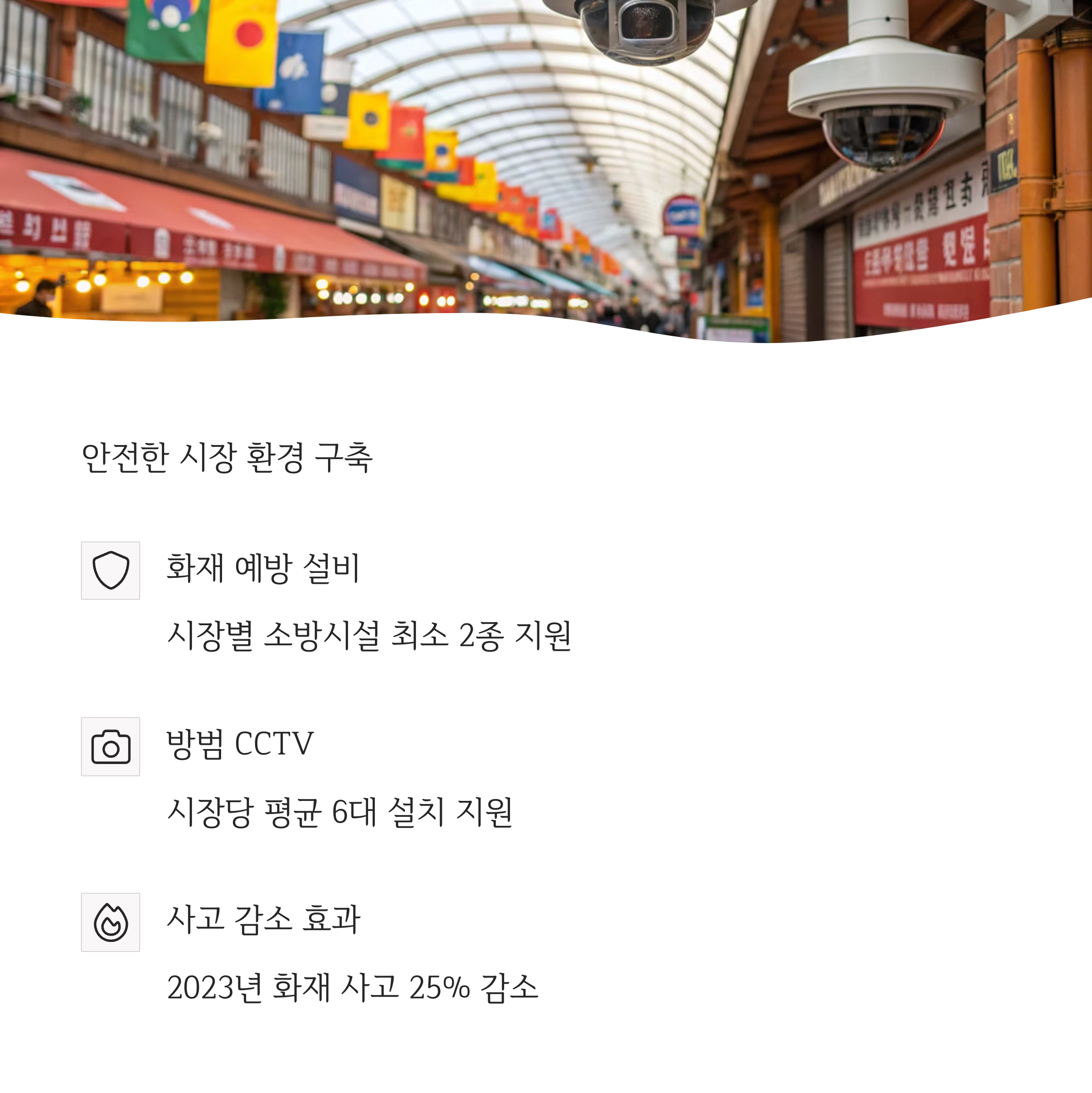 시장 내 화재 예방 시스템, 방범용 CCTV, 소화기 설치 등이 포함된 항목입니다.